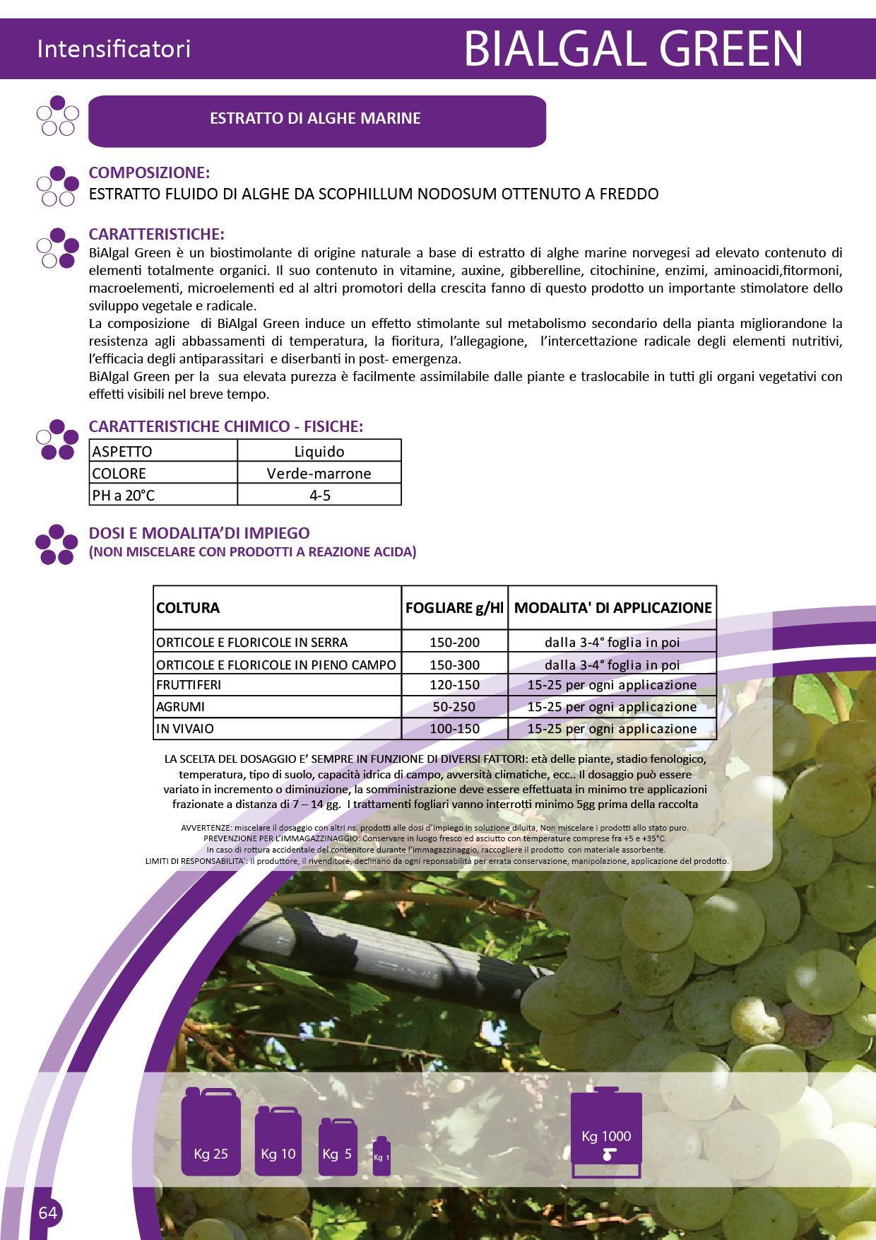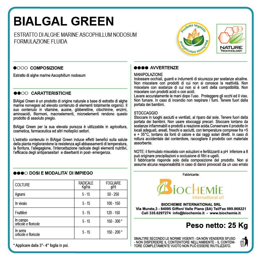 BiAlgal Green è un biostimolante di origine naturale a base di estratto di alghe marine norvegesi ad elevato contenuto di elementi totalmente organici. Il suo contenuto in vitamine, auxine, gibberelline, citochinine, enzimi, aminoacidi, fitormoni, macroelementi, microelementi ed al altri promotori della crescita fanno di questo prodotto un importante stimolatore dello sviluppo vegetale e radicale.