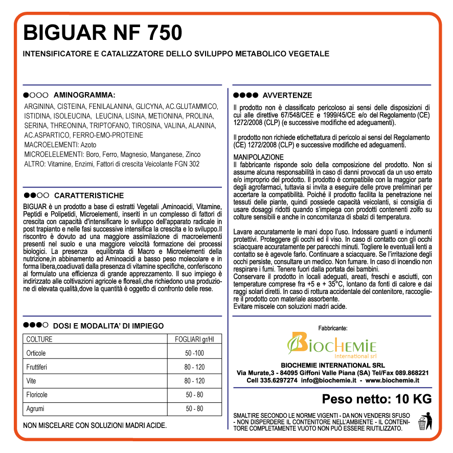 BIGUAR è un prodotto a base di estratti Vegetali, Aminoacidi, Vitamine, Peptidi, Polipetidi e Microelementi inseriti in un complesso di fattori di crescita con capacità d’intensificare lo sviluppo dell’apparato radicale in post trapianto e, nelle fasi successive, la crescita e lo sviluppo della pianta. Il riscontro è dovuto ad una maggiore assimilazione di macroelementi presenti nel suolo e una maggiore velocità di formazione dei processi biologici. La presenza equilibrata di Macro e Microelementi della nutrizione, in  abbinamento ad Aminoacidi a basso peso molecolare e in forma libera, coadiuvati dalla presenza di vitamine specifiche, conferiscono al formulato una efficienza di grande apprezzamento. Il suo impiego è indirizzato alle coltivazioni agricole e floreali che richiedono una produzione di elevata qualità, dove la quantità è oggetto di confronto delle rese.