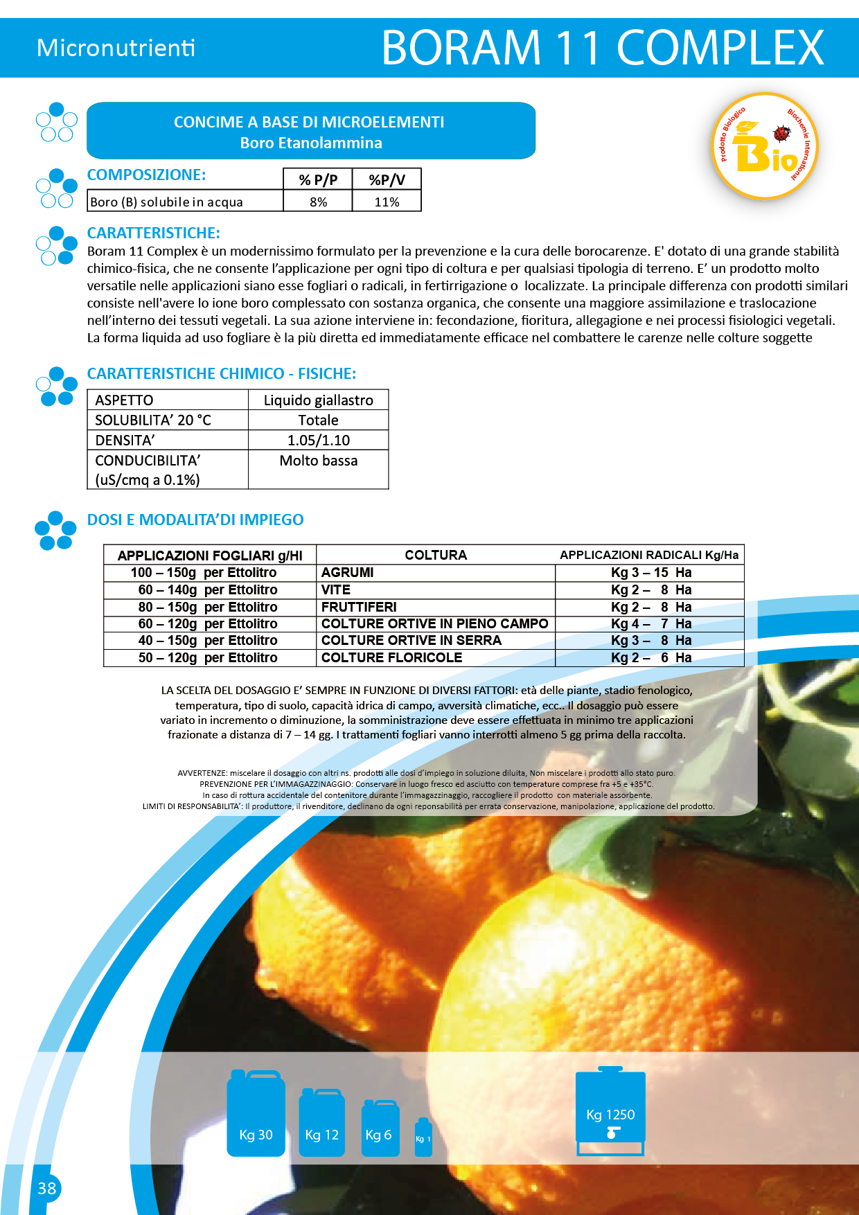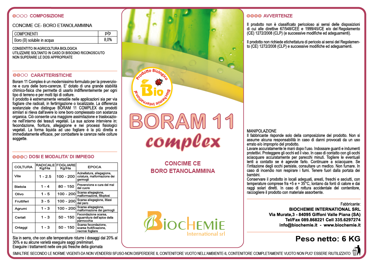 Boram 11 Complex è un modernissimo formulato per la prevenzione e la cura delle borocarenze. E’ dotato di una grande stabilità chimico-fisica, che ne consente l’applicazione per ogni tipo di coltura e per qualsiasi tipologia di terreno. E’ un prodotto molto versatile nelle applicazioni siano esse fogliari o radicali, in fertirrigazione o localizzate. La principale differenza con prodotti similari consiste nell’avere lo ione boro complessato con sostanza organica, che consente una maggiore assimilazione e traslocazione nell’interno dei tessuti vegetali. La sua azione interviene in: fecondazione, fioritura, allegagione e nei processi fisiologici vegetali. La forma liquida ad uso fogliare è la più diretta ed immediatamente efficace nel combattere le carenze nelle colture soggette.